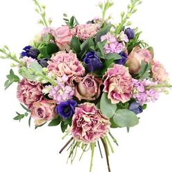 Celebrating the thriving spirit of Woolwich, this expertly gathered bouquet bursts with both vibrancy and poise. Plump hydrangeas in deep blue, teal, and muted violet take centre stage, their myriad petals stacked gracefully, reminiscent of the lush displays found near Woolwich's celebrated markets and riverside walkways. Nestled within this tapestry, lilac and lavender roses unfold delicately, their soft, full forms lending a sense of romance and refined tradition. Creamy ranunculus, layered in satin-like moiré, partner harmoniously with white lisianthus buds and half-open blooms, their presence infusing a subtle glow and hinting at renewal. Sprinkles of deep fuchsia-pink filler flowers bring a lively accent, while airy plumes of pale pink astilbe soften the bouquet's perimeter, echoing the whimsical charm of springtime strolls through local parks. Lacy fillers of pale green and white, whisper-thin and exquisite, thread between blooms for depth and movement, much like Woolwich's blend of historical texture and emerging vibrance. Framing the arrangement, rich green foliage lends fresh structure without overpowering the delicate composition. Finished with a wide, lustrous royal purple satin ribbon, the bouquet exudes sophistication and unity-much like the borough itself. Whether for a milestone birthday, to brighten a riverside apartment, or to surprise a loved one in the Woolwich community, this arrangement is crafted to tell a local story with every carefully chosen bloom.